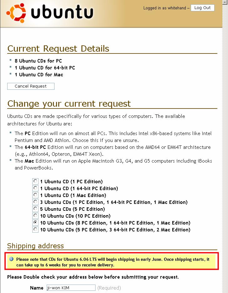 우분투 리눅스 CD 를 신청했다. 배로 온다는데, 대략 6주 가량 소요되는 듯 하다. 쓰게 될 수 있을런지 모르 겠지만, 대략 수집 차원으로 하나 신청 했다. 10장 들이로..ㅋㅋㅋ [6월에 출발해서 6주면 8월인가.??] Post navigation Install UBUNTU …X-note
