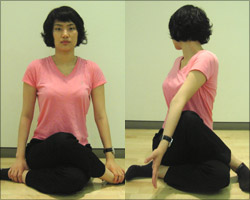 ② 첫 번째 동작처럼 앉은 뒤 허리를 곧추세운다. 이때 위쪽에 올려져 있는 (오른쪽) 다리 쪽 무릎을 세우고 들려진 방향의 엉덩이가 바닥에서 떨어지지 않도록 한다. 오른쪽 다리가 세워져 있다면 반대 방향인 왼쪽 팔꿈치를 쭉 뻗어 무릎에 얹고 오른팔은 엉덩이 바로 뒤쪽으로 살짝 짚는다. 두 엉덩이가 바닥에 균등하게 닿은 상태에서 허리를 튼다. 반대쪽도 같은 방법으로 반복한다.
