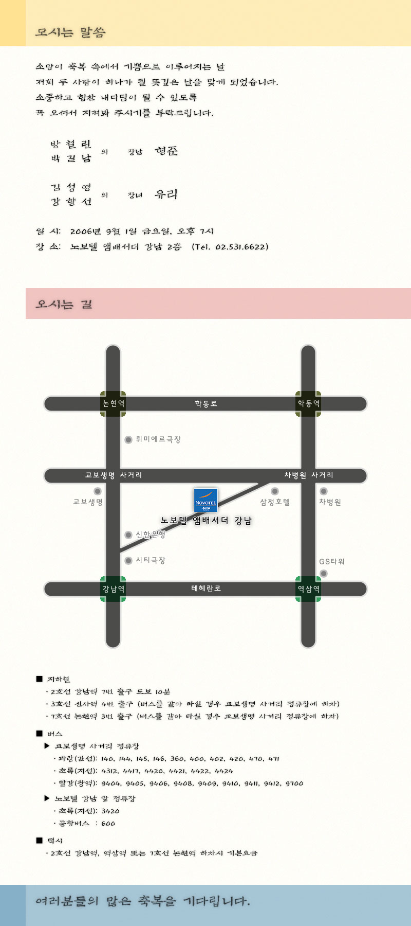 2006년 9월 1일 방형준 결혼식. 빨리도 하네, 조금 있으면 일경이도 결혼식인데 부조금만 연일지출이네.. 작작좀 하지. 청첩장까지 받았으니, 안 볼 수도 없고 쩝. Post navigation 울산 나들이….겸…위문 공연Last Work Shop In 2006.10.20