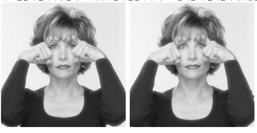 2. 둘째손가락에 힘을 주며 아래를 향해 밀고, 눈썹은 위로 치켜올린다.