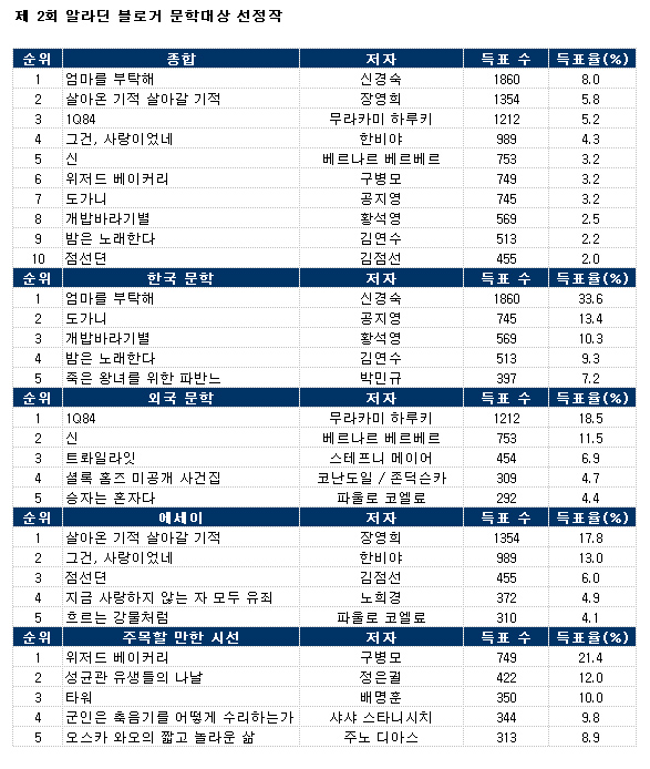 인터넷 서점 알라딘에서 조사한 도서 통계 입니다. 음 .. 가을이 온지라… 독서를 한번(???) …도전해 보겠습니다. 난.독.증……( 솔직해 지자면…… 책읽기를 싫어하는…. ) Post navigation 대략 앞으로 봐 두면 좋은..2009 우수교양도서 선정 목록