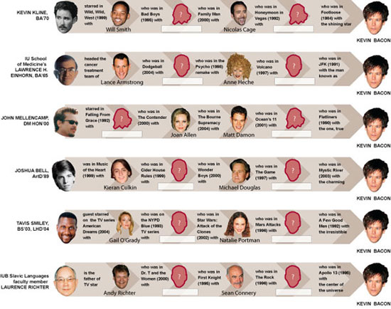 케빈 베이컨은 6단계의 인맥안에서 거의 모든 또는 모든 사람들과 관계다 있다고(연결될 수 있다고) 합니다. 그는 헐리우드의 모든 배우들과 6단계의 관계를 통해 연결되어 있다고 하는 주장을 내 걸었다고 합니다. 이는 한 실험으로 이어졌으며, 미국에서 소포를 서쪽 끝에서 동쪽 끝의 어떤 이에게 전달하는 게임을 수했는데, 실제로 6단계의 과정을 거쳐, 수신자는 전혀 모르는 사람임에도 소포는 전달되었다고 합니다.